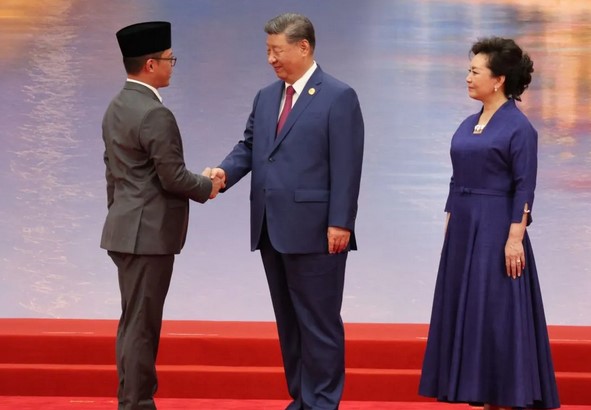 China, 1 September 2025- Presiden China Xi Jinping bersama istri, Madam Peng Liyuan, menyambut Menteri Luar Negeri Indonesia Sugiono pada jamuan makan malam sebelum pembukaan Konferensi Tingkat Tinggi (KTT) Shanghai Cooperation Organisation (SCO) yang digelar di Tianjin pada Minggu (31/8).